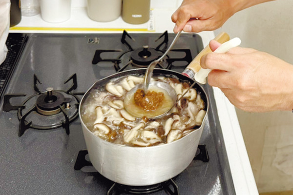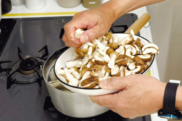 2. しいたけ・しめじを加え、さらに5分ほど煮て旨味を引き出す。