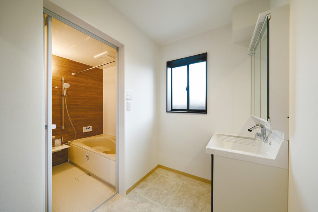 新たに脱衣室をつくり、導線も変更。存在感があった柱の位置を移動させて壁の中に収める工事も施しました。これによって壁ができたにもかかわらず、広々とした解放感は保たれています。