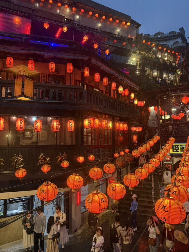 1日目には、『千と千尋の神隠し』に近い雰囲気を持つ観光名所「九份(きゅうふん)」を訪れて、写真を撮りました。夜になると、赤い提灯がライトアップされて、本当に映画の世界に入ったような気分になれました。雨が降ったり止んだりして霧が出ていたのですが、夜景は非常にきれいだったので、ぜひ台湾に行く機会がある方は行ってみてください。下の写真は、九份に行った時の写真です!